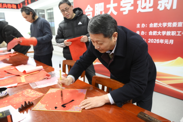 来自我校教育学院(美育中心、高等教育研究所)的陶莉、童峰、梁庆宏,生命健康与环境工程学院的王磊老师现场挥毫泼墨,将新春的美好期许融入一副副春联之中。本次活动还特邀安徽省书法家协会副主席王涛、中国书法家协会会员欧新中、安徽省青年书法家协会副主席温祥等知名书法家亲临现场,挥毫泼墨为教职工们现场书写寓意吉祥、饱含祝福的春联与“福”字。