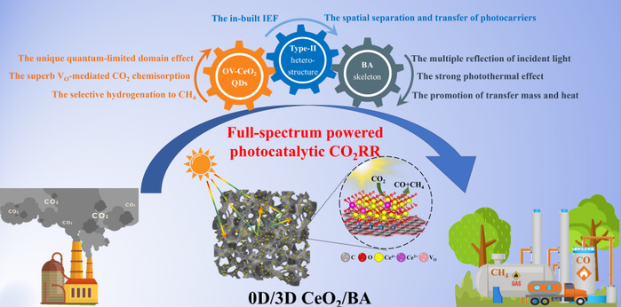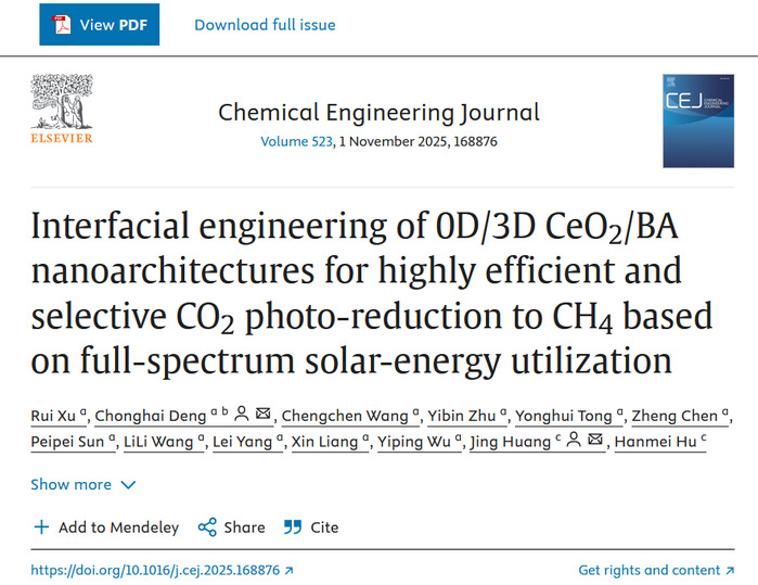 近日,我校能源材料与化工学院邓崇海团队在针对温室气体二氧化碳资源化转化为高附加值合成气(甲烷)方面取得重要研究进展,相关研究成果发表于工程材料类国际权威期刊《Chemical Engineering Journal》(中科院一区TOP,影响因子13.2),题为《Interfacial engineering of 0D/3D CeO2/BA nanoarchitectures for highly efficient and selective CO2 photo-reduction to CH4 based on full-spectrum solar-energy utilization》。