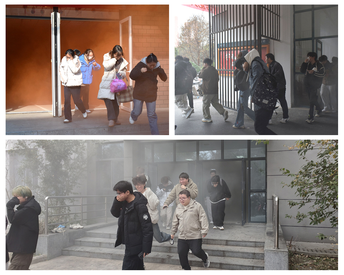 下午13时30分,警报声准时响起,演练正式开始。楼内应急广播同步发出疏散通知,各楼层引导员和宿舍管理员迅速就位,在模拟烟雾中指挥引导。参演学生用湿毛巾或衣物捂住口鼻,压低身体,沿预定路线快速、有序撤离。整个过程紧张而不慌乱,不到五分钟,所有学生均安全抵达指定集结区域。