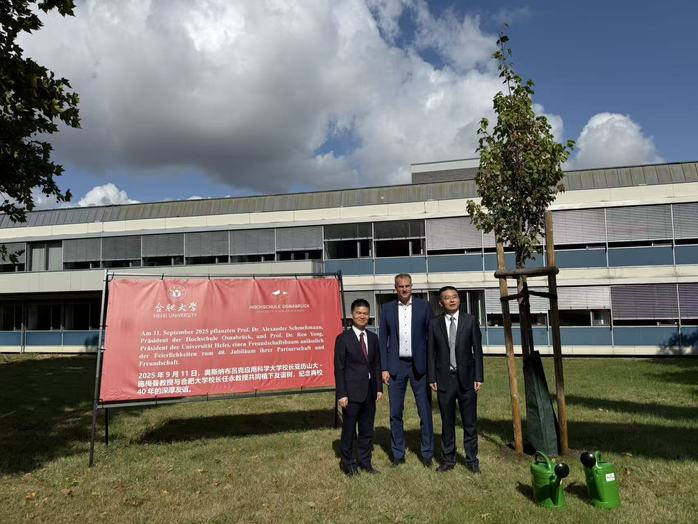 奥斯纳布吕克应用科学大学是我校自1985年开始合作的重要德国高校。自建立合作关系以来,双方在人才培养、科研合作、师资交流等领域开展了卓有成效的合作,此次40周年庆典也成为两校深化友谊、共话未来的重要契机。9月11日下午,在省委教育工委委员、安徽省教育厅总督学邵曙光及中德高校代表的见证下,校长任永教授与奥斯纳布吕克应用科学大学校长亚历山大・施梅曼教授共同种植象征友谊的枫树。施梅曼表示,枫树春绿秋红的生长特性恰如两校合作40年来持续焕发活力,结出丰硕成果,未来学校将进一步在中外合作办学机构建设、联合科研项目开展等方面深化与合肥大学的合作。随后,代表团在施梅曼的陪同下,参观了该校工程与计算机科学学院的底盘技术实验室、热能源技术实验室等核心教学科研平台。