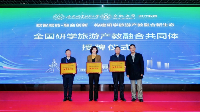 12月6日,全国研学旅游产教融合共同体成立大会在安徽职业技术大学召开。大会以“数智赋能·融合创新——构建研学旅游产教融合新生态”为主题,汇聚来自全国百余家院校、企业及主管部门的近400名代表。合肥大学作为联合发起单位之一,校党委副书记周飞出席大会并致辞。