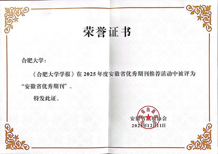 近日,在安徽省出版协会举办的2025年度安徽省优秀期刊评比活动中,《合肥大学学报》喜获“安徽省优秀期刊”荣誉称号,这是对《合肥大学学报》长期以来坚持正确办刊方向、不断提升学术质量和出版水平的高度认可与肯定。