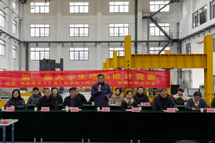 1月6日,合肥大学第十七届科技节——第一届大学生结构设计竞赛开幕式在53栋辅楼实验大厅举行。校党委副书记周飞出席。本次竞赛由校团委、创新创业学院主办,智能建造与交通工程学院、构力协会、新语心职工作室等单位协办,吸引全校32组、100余名学子跨专业参赛。