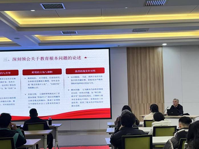 校党委书记邬平川以“深学细悟习近平总书记关于教育的重要论述 以教育家精神铸魂强师”主题作培训总结报告,激励新教师深学细悟习近平总书记关于教育的重要论述,自觉践行教育家精神。