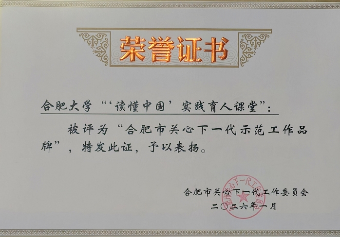 1月30日,合肥市关工委2026年度工作会议召开。会议宣读了合肥市关心下一代工作“双十佳、两示范”命名表彰文件,我校阳光工作室被授予“示范‘五老’工作室”,“读懂中国”实践育人课堂被评为 “示范工作品牌”。