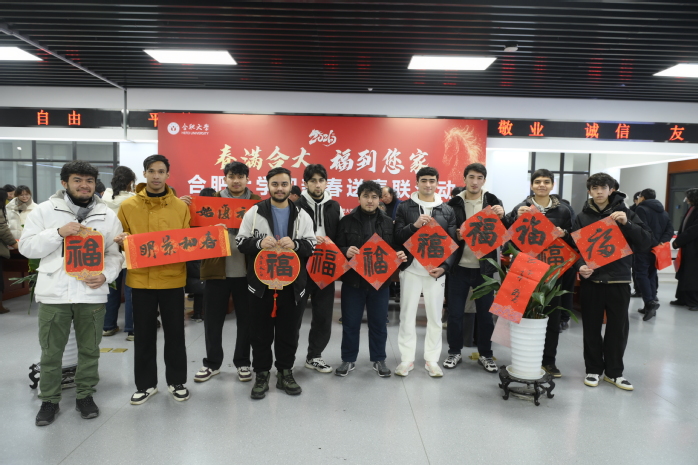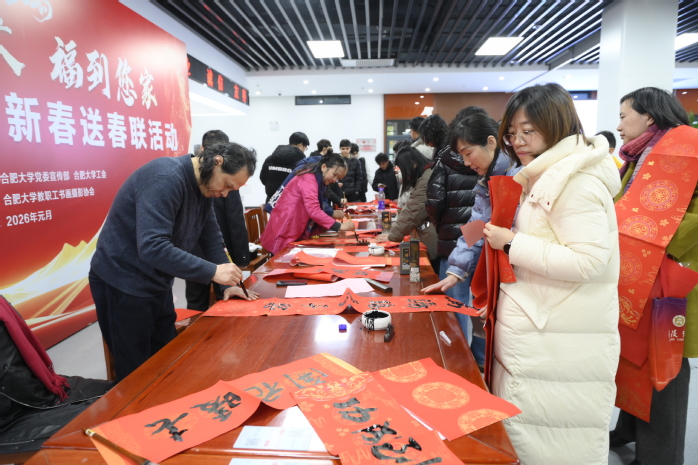翰墨飘香添雅韵,春联焕彩贺新春。1月30日,在农历丙午马年新春佳节即将来临之际,由党委宣传部、校工会主办,教职工书画摄影协会承办,以“春满合大・福到您家”为主题的迎新春送春联活动在二期大学生活动中心举行。校领导邬平川、任永、周飞、白义香、吴功福、王晓峰亲临活动现场指导。