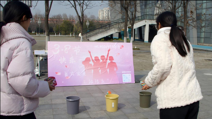 “三月芳菲 悦动巾帼”趣味挑战赛的迷你高尔夫区,选手们屏气凝神,瞄准挥杆,小白球在空中划出弧线,精准落洞的瞬间引来阵阵喝彩;半管运乒乓球区与叠叠高区,师生共同协作控制平衡,展现耐心与细致;抓塑料袋区,师生们根据风向巧妙调整姿势,将空中的塑料袋稳稳抓住。