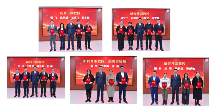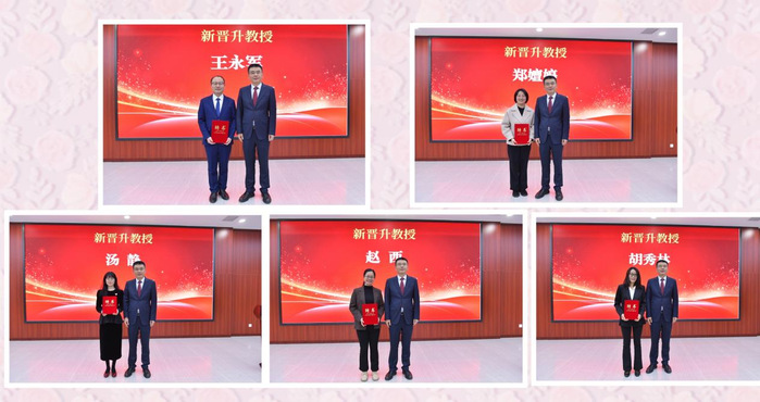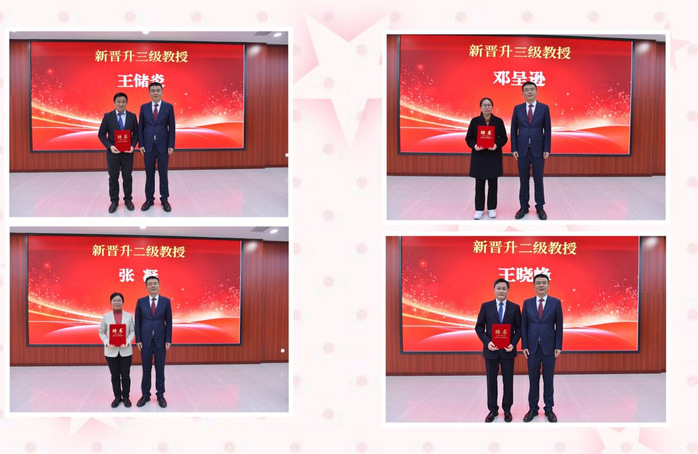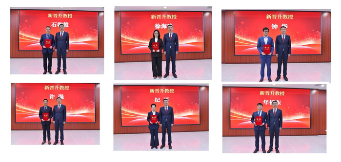 聘任仪式上,校党委副书记周飞宣读了2025年度新晋升高级职称教师聘任文件。任永逐一为新晋升高级职称教师、三级教授、二级教授颁发聘任证书并合影留念。
