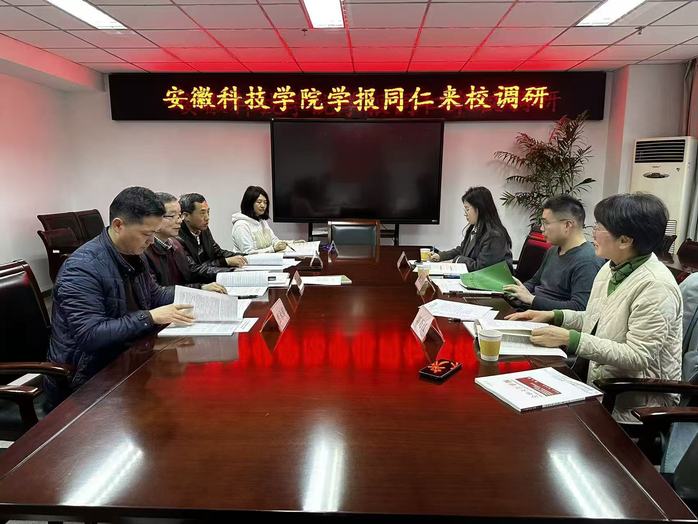 3月18日,安徽科技学院学报编审室主任顾文亮带队来我校学报编辑部调研。学报编辑部主任汪潘义在会议室热情接待了顾文亮一行。