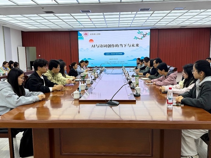 彭玉平旁征博引、妙语连珠,将严谨的学术观点与风趣的讲解融为一体,现场气氛轻松活跃,师生在会心笑声中加深了对AI与诗词创作关系的理解。在互动环节,他就AI与古典诗词传承、文科生如何应对技术变革等话题与现场师生深入交流,勉励大家入门要正,坚持用AI而不为AI所用。