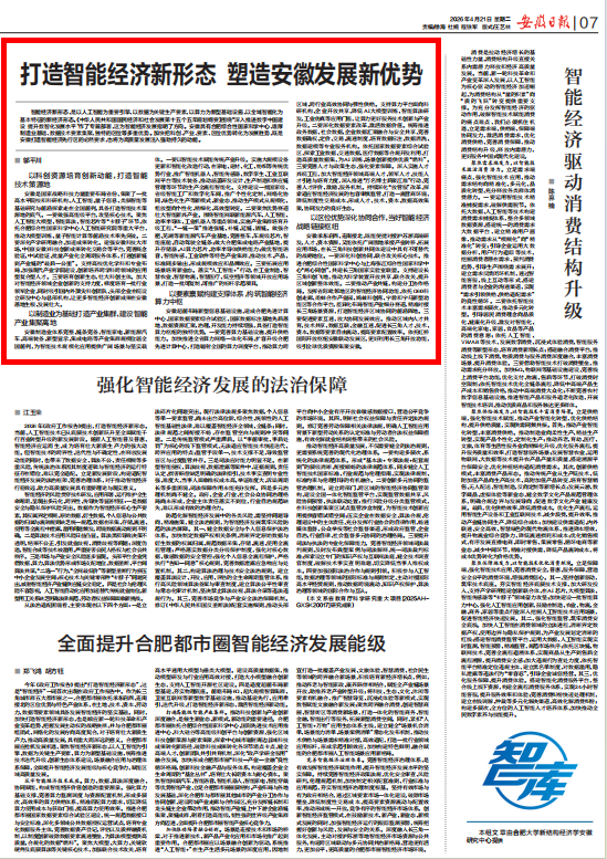 4月21日,《安徽日报》刊登了我校党委书记邬平川署名的文章《打造智能经济新形态塑造安徽发展新优势》。文章立足安徽科创、产业、要素、区位多重优势,系统阐述了以智能经济新形态引领高质量发展的战略路径。