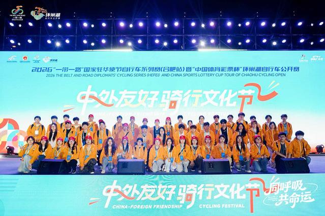 4月18日至19日,2026“一带一路”国家驻华使节自行车系列赛暨环巢湖自行车公开赛在合肥成功举办。我校210名学生志愿者全程参与赛事保障工作。