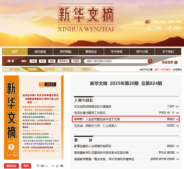 近日,《新华文摘》2025年第20期“人物与回忆”栏目全文转载我校文化与旅游学院黄艳芬教授的文章《李霁野:人生的可爱处多半在于无常》,该文原刊载于《名人传记》2025年第7期。该文以传记笔法,对文学史料采取客观叙述,讲述了中国现代文学社团未名社中的安徽霍邱叶集作家、翻译家李霁野的人生,展现其投身新文化运动,师从鲁迅,师生联手发起成立未名社,社团同人的交游与情感,以及促成叶嘉莹落地南开大学等经历。在对作家生平往事的述写中,勾勒描绘了20世纪中国文学史的发展,以及从鲁迅到李霁野到叶嘉莹三代知识分子的家国情怀。该文系黄艳芬教授地域文化研究的最新代表性成果,体现了微观史的研究路径与撰写方式。《新华文摘》由国家新闻出版署主管、人民出版社主办,是大型的理论性、综合性、资料性的文摘类权威期刊,以思想性、学术性、权威性和可读性享誉海内外,是我国最具影响力的哲学社会科学文摘类期刊之一。来源:文化与旅游学院 编辑:陈囿 预审:丁增武 审核:贾峰