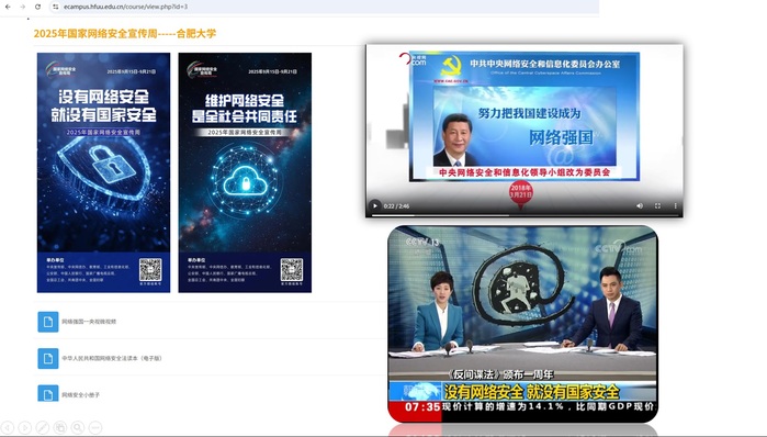 9月15日,党委宣传部和网信办积极发挥校园媒体教育引导作用,通过校园网主站、合肥大学“2025年国家网络安全宣传周”专题网站和线下展板集中宣传“网络安全为人民、网络安全靠人民——以高水平安全守护高质量发展”网络安全周主题。内容丰富的专题网站融合了大量网络强国、国家网络安全、法律法规、安全的网络工作与生活等方面视频学习内容,将网络安全宣传融入校园生活场景,强化师生对网络安全重要性的认知,网络安全周期间电子资源访问量过万。