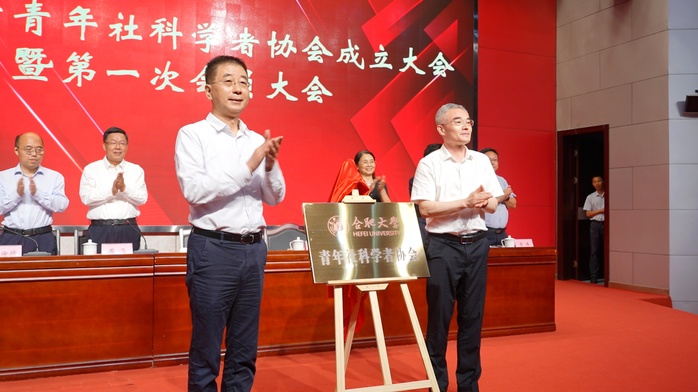 会上,江涛和邬平川共同为“合肥大学青年社科学者协会”揭牌。周泽将代表安徽省社科界青年学者协会致贺辞。