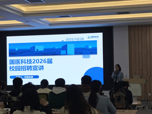 宣讲会上,国医科技人力资源总监欧阳林娜向到场同学全面介绍了公司的基本情况、行业地位及发展前景。她详细讲解了国医科技在医用物资智慧供应链管理领域的技术优势,特别是人工智能与大数据技术在医疗物资管理中的创新应用。作为我院的校企合作单位,国医科技还重点介绍了为合肥大学学子量身定制的薪酬体系、福利待遇、职业发展通道和培训学习机制。
