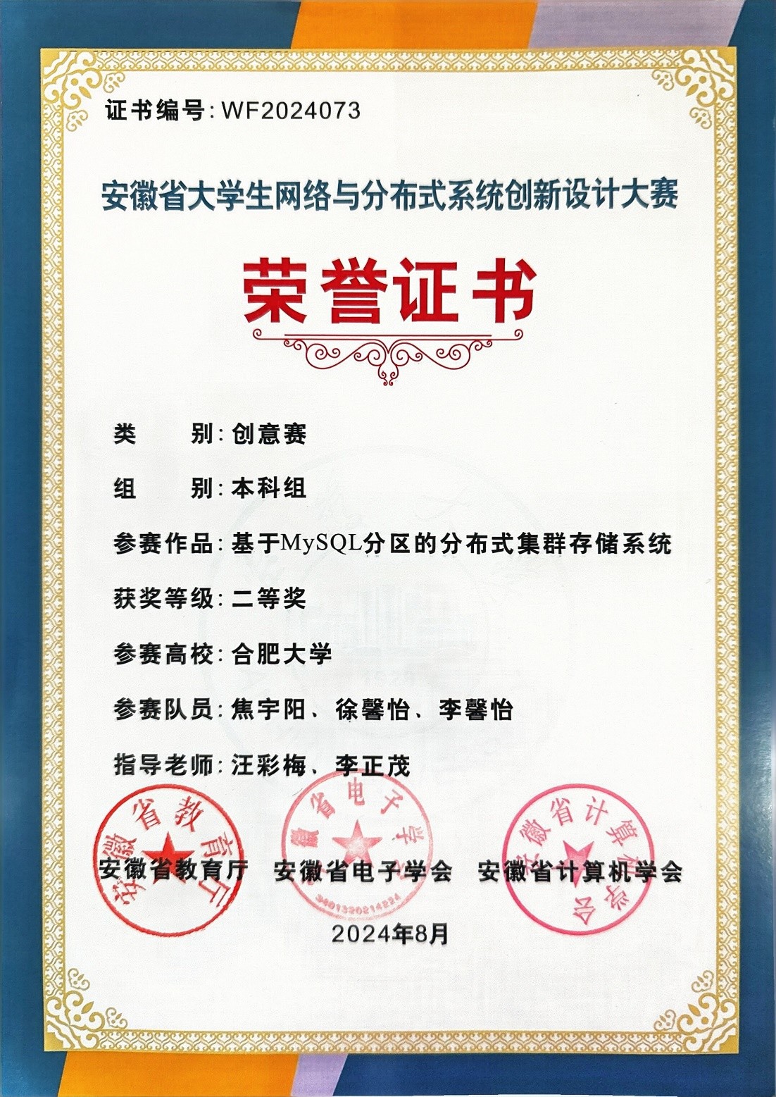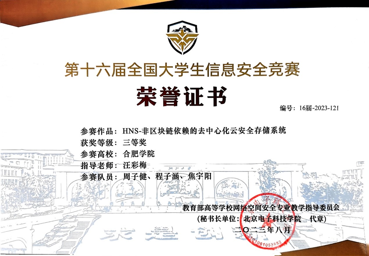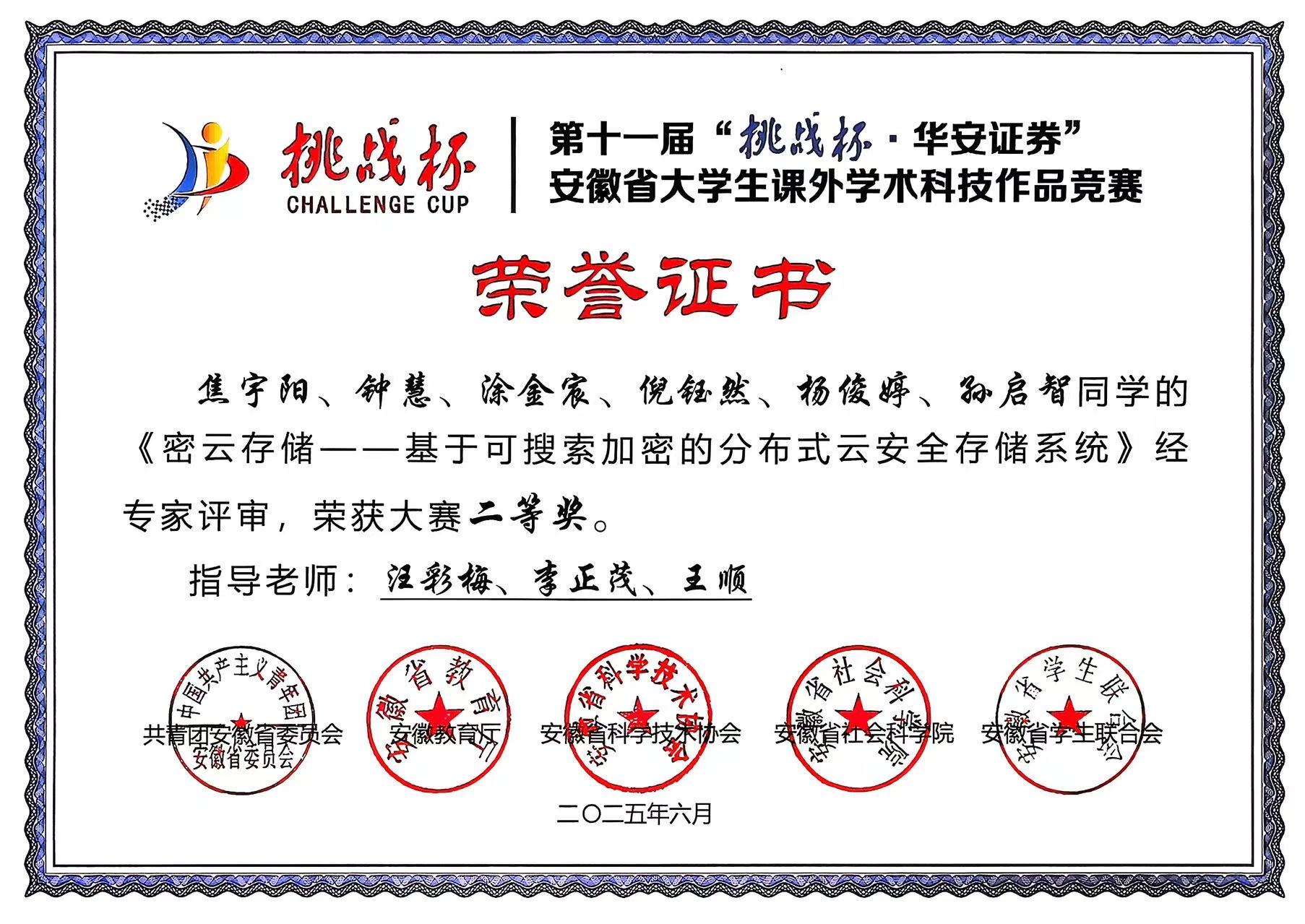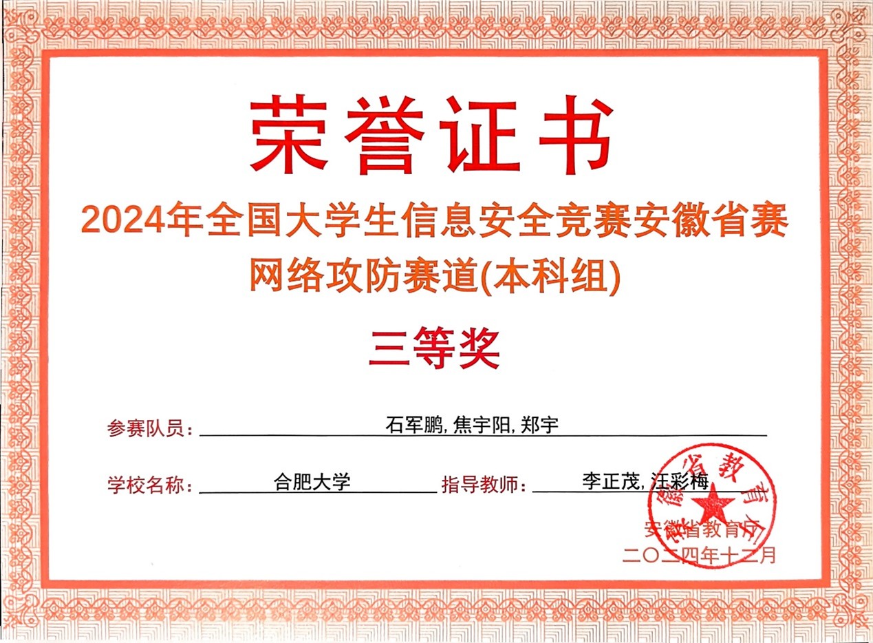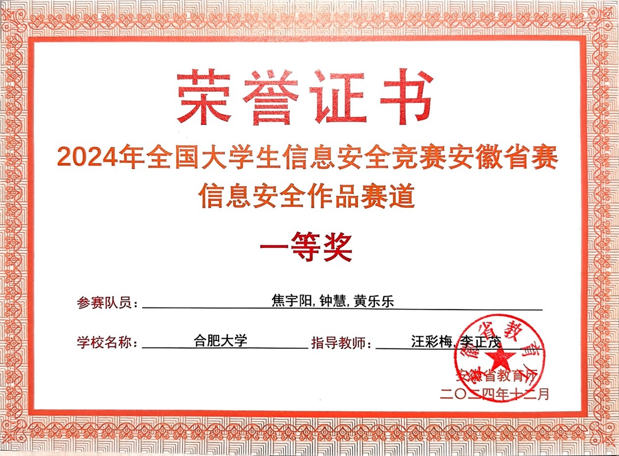 焦宇阳,男,汉族,2004年4月出生,中共预备党员,合肥大学人工智能与大数据学院网络工程专业2022级本科生,担任班级副班长,合肥大学网络与信息安全创新实验室学生负责人。2024-2025年度学业成绩和综合测评成绩双第一,先后多次获得国家奖学金、合肥大学特等奖学金、优秀团干、三好学生等荣誉。在学科竞赛方面,曾获2024年全国大学生信息安全竞赛安徽省一等奖、第十届“挑战杯·华安证券”安徽省大学生课外学术科技作品竞赛一等奖、2024年安徽省大学生网络与分布式系统创新设计大赛二等奖、第十六届全国大学生信息安全竞赛全国三等奖等10余项省级及以上奖项。他专注学科前沿,围绕信息安全技术开展研究,已在投学术论文1篇;授权计算机软件著作权1项(唯一著作权人),在审1项;申请发明专利3项(1项授权,2项实审);主持和参与安徽省大学生创新创业训练项目2项;作为负责人带领团队研发的科技作品已在国家发改委批准建设单位使用测试,技术应用价值得到验证,并获得多位高校专家推荐。学习之余,他曾担任学院青志联部长,积极参加志愿活动,多次受到通报表扬,累计志愿服务时长超200小时。