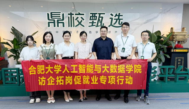 2025年7月10日,为帮助毕业生拓展更多实习、就业渠道,促进校企合作共赢。合肥大学人工智能与大数据学院党委副书记姚蓓蓓一行赴安徽鼎校教育科技有限公司开展“访企拓岗促就业专项行动”,安徽鼎校教育科技有限公司全国交付运营中心总经理姜思卫、高校合作部项目经理赵研、袁国诏等人进行了热情接待。