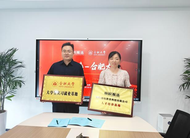 在双方的共同见证下,安徽鼎校教育科技有限公司与合肥大学人工智能与大数据学院正式签署实习基地合作协议,并举行授牌仪式,合影留念。