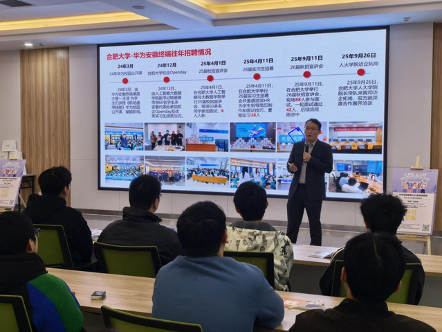 随后,活动进入正式宣讲环节。华为终端HR时梅女士主持开场。华为终端主管郭世兴先生系统介绍了华为终端业务的发展现状及2026年校招计划,并结合详实的案例,深入阐述了公司的核心人才理念。现场播放的合肥大学校友在公司工作生活的视频,更是引起了在场同学们的强烈共鸣,增强了大家对未来职业发展的信心。