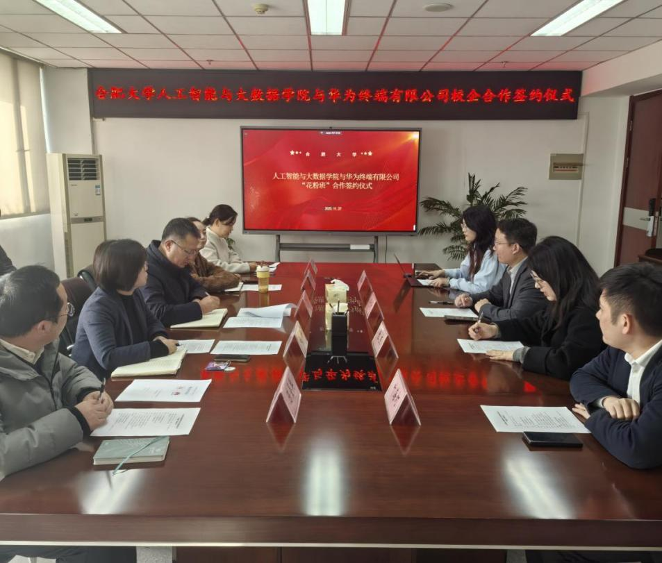 11月27日下午,合肥大学人工智能与大数据学院与华为终端有限公司校企合作签约仪式在行政楼7楼会议室举行。
