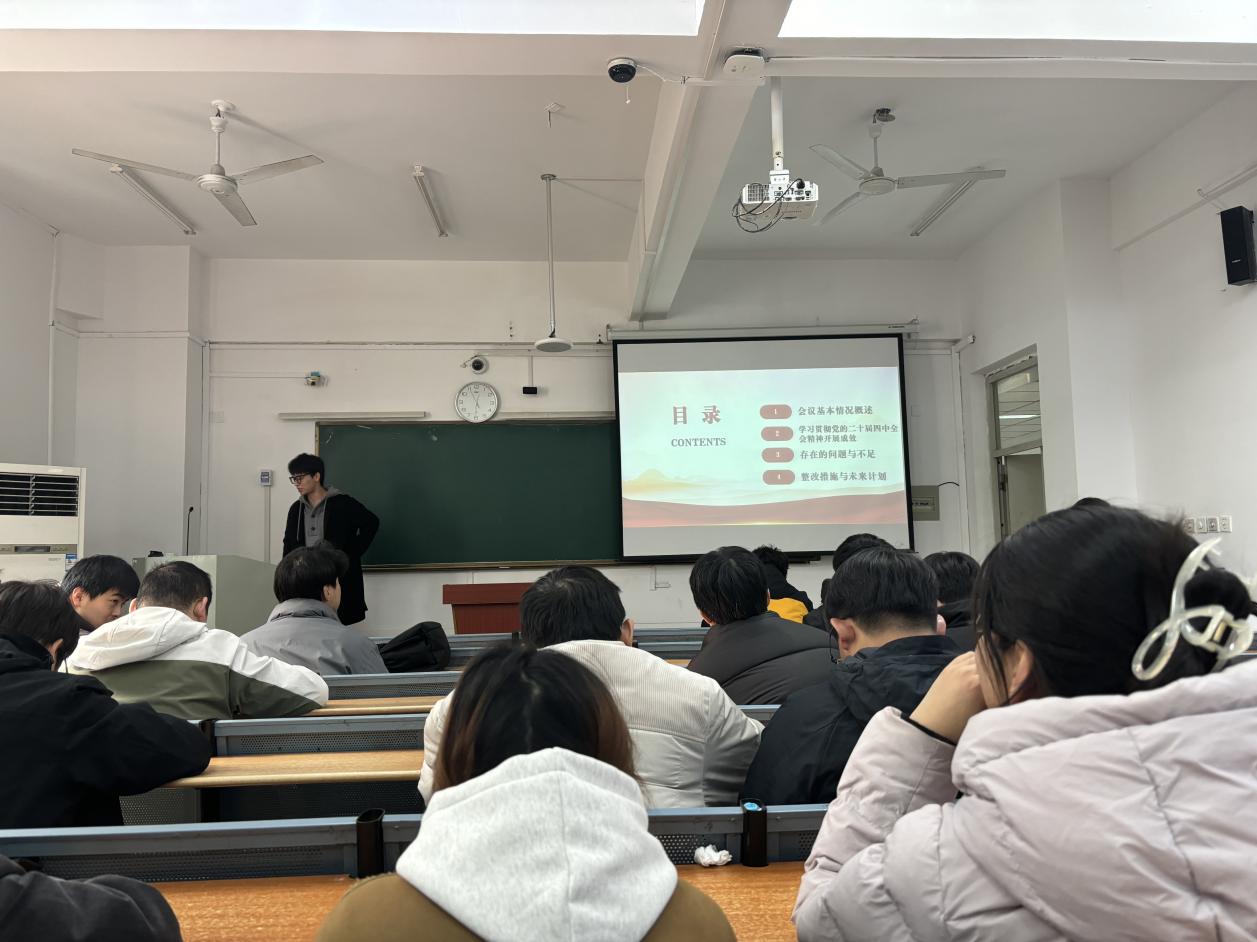 会上,张金辉同学从会议背景、核心任务与支部学习情况等方面进行了详细介绍,并系统阐释了全会的重大意义以及“十五五”时期的发展方向和重点举措。他指出,研究生群体要以多种方式扎实推进全会精神学习教育,将学习成果有效融入科研创新等实际工作中,实现理论学习与实践工作深度联动。