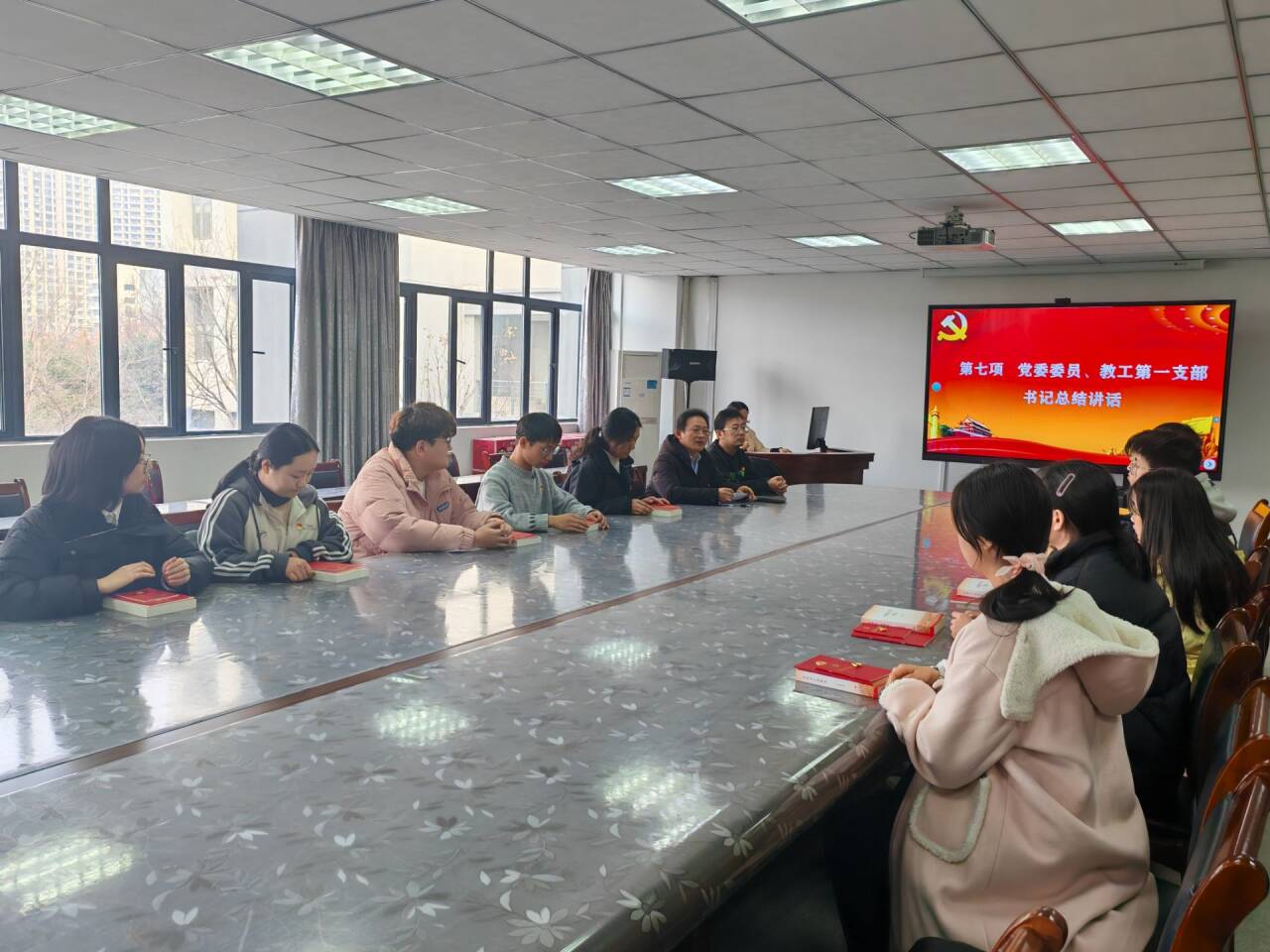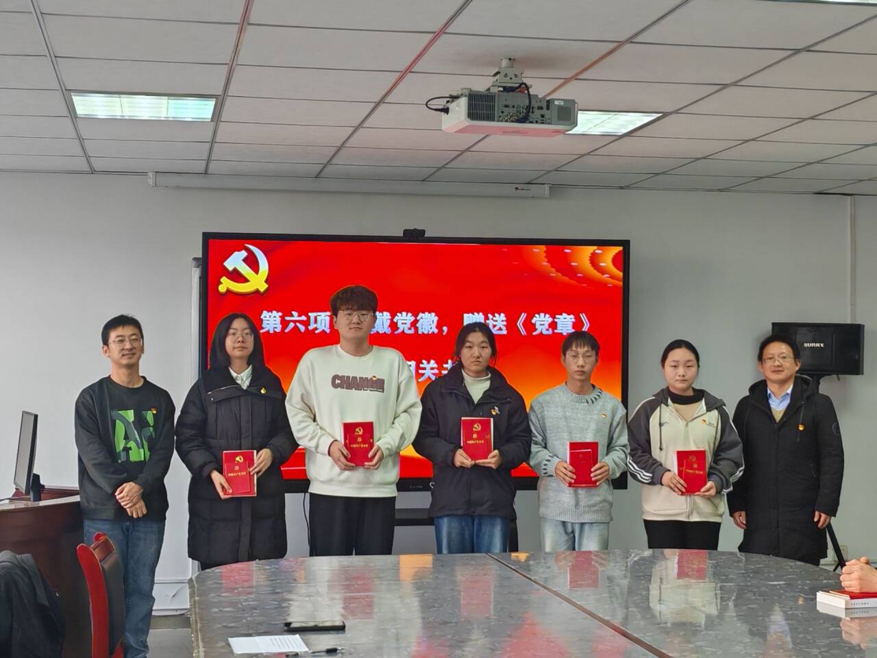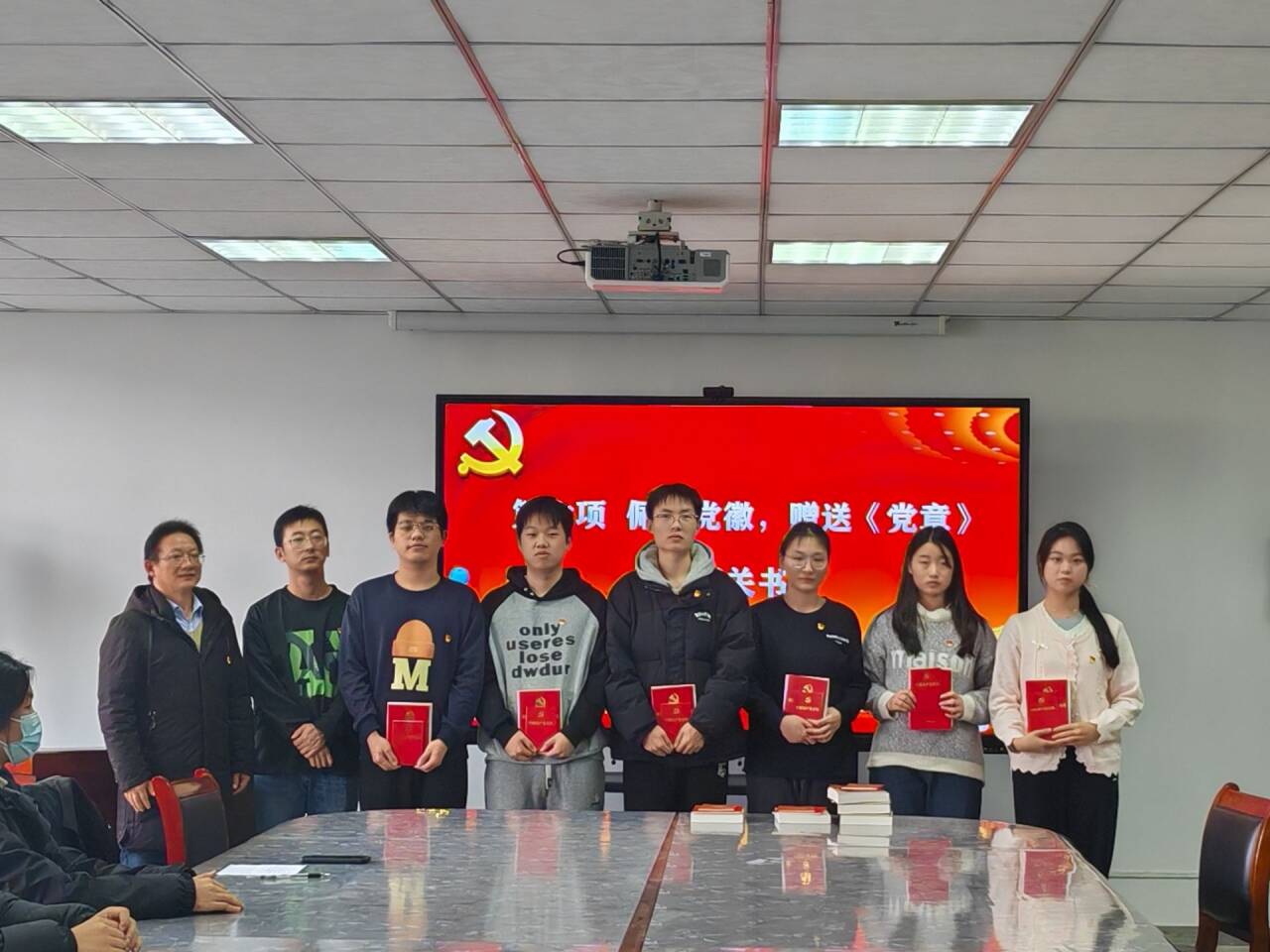 何立新和汪剑为11名新发展的预备党员佩戴党徽,赠送《中国共产党简史》《党章》等相关书籍并合影留念。
