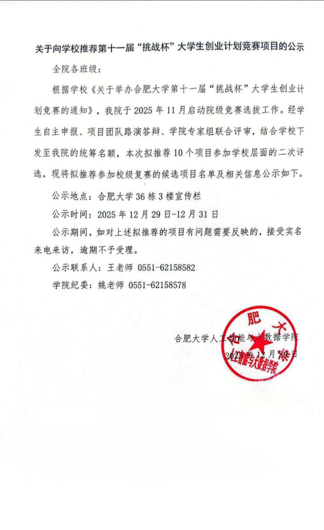 关于向学校推荐第十一届“挑战杯”大学生创业计划竞赛项目的公示