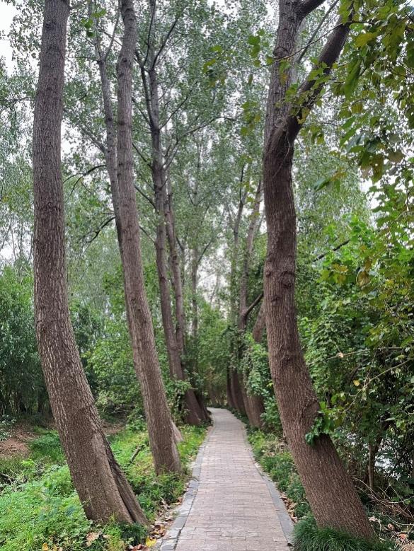 进入园区腹地,成片水杉林映入眼帘。林间步道干净整洁,绿荫成行。我们沿着林间石板路缓步行走,明显感受到气温与外部道路的差异,空气湿润清新。我们在此记录植被分布情况,并交流城市绿地在改善微气候、提升居民休闲体验方面的作用。相较资料中的“工业锈带”,眼前的“生态绿廊”让人直观感受到环境治理的现实成效。
