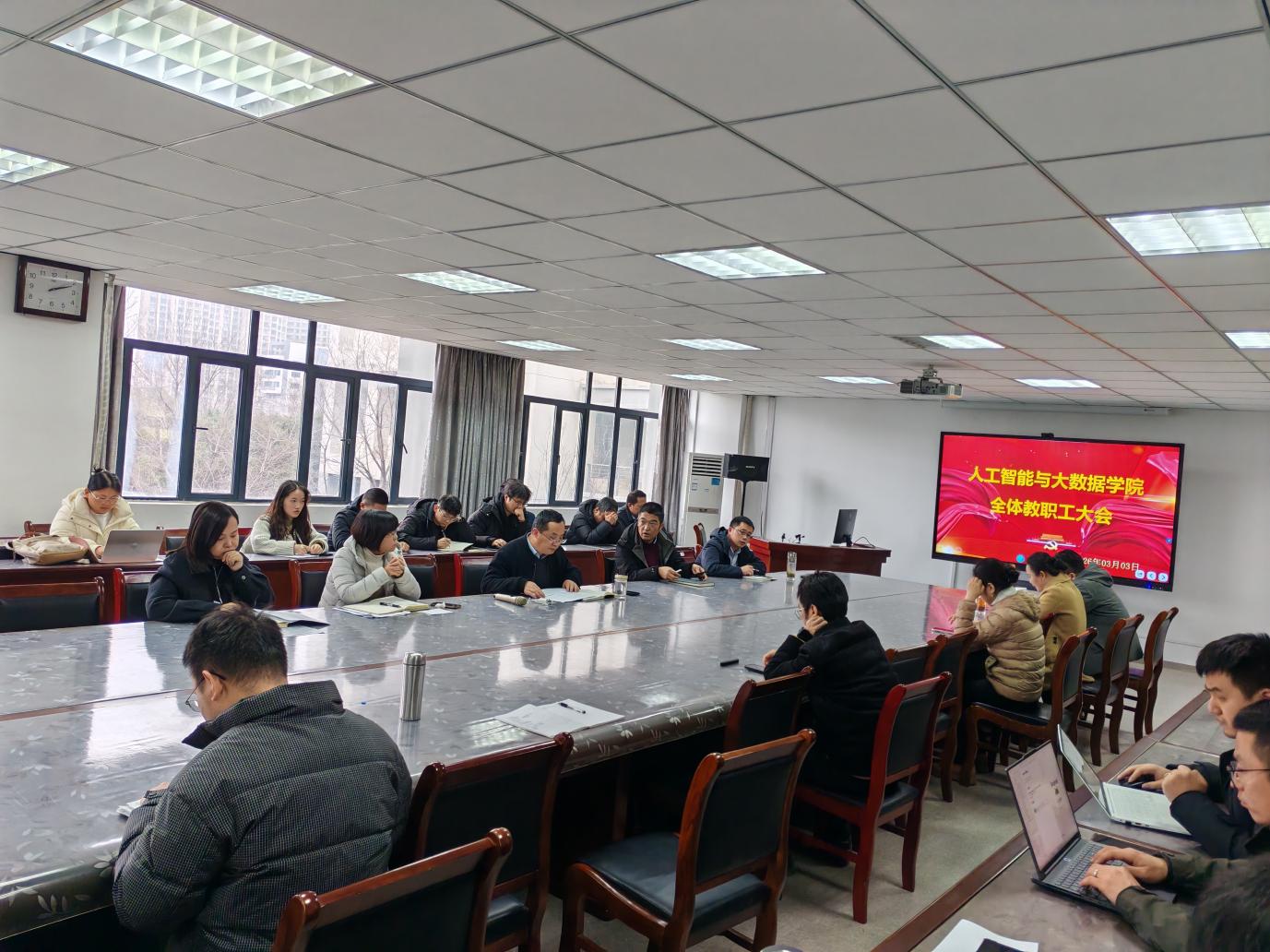为全面贯彻学校2026年工作部署,统一思想、明确任务、压实责任,确保新学期各项工作平稳有序推进,3月3日下午,人工智能与大数据学院在学院会议室隆重召开 2026 年春季新学期全体教职工大会。学院领导班子、全体教职工参加会议,会议由学院院长陈圣兵主持。