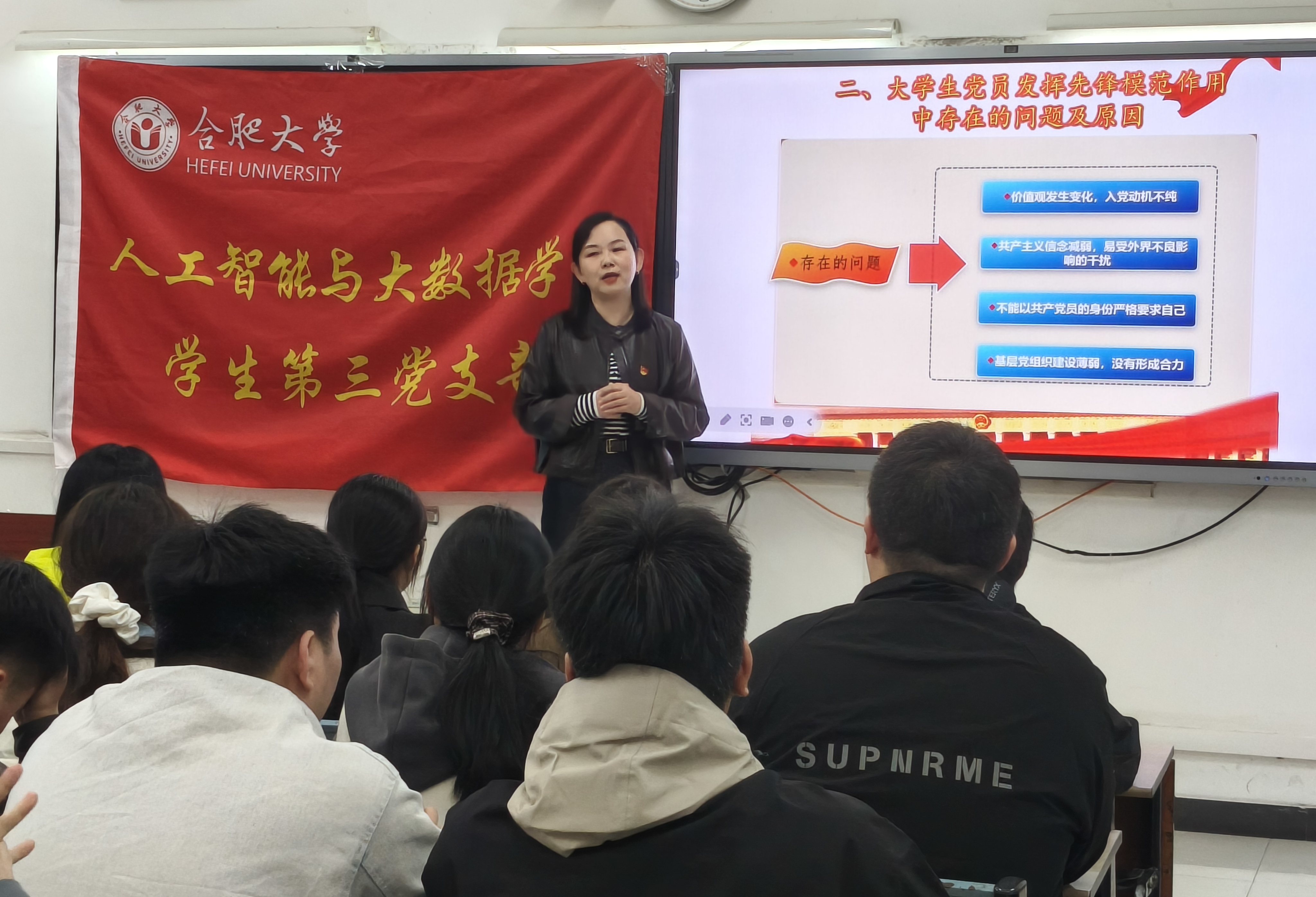 2026年3月31日,学院党委副书记、纪委书记姚娜以“发挥先锋模范作用,争做新时代合格大学生党员”为主题为人工智能与大数据学院学生第三党支部党员讲授专题党课。活动由支部书记苗冰涛主持,支部全体党员参加。