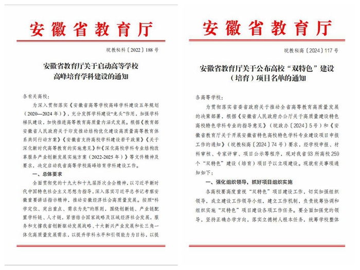 《安徽省教育厅关于公布高校“双特色”建设(培育)项目名单的通知》