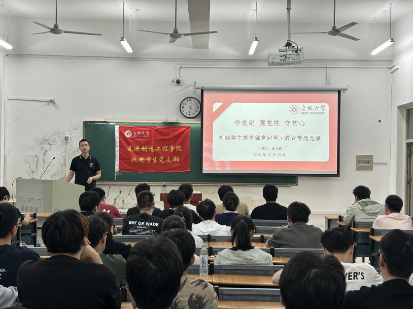 为深入学习贯彻习近平总书记关于加强党的纪律教育的重要论述,增强广大学生党员对正风肃纪的规律性认识,2024年5月23日晚上18:30分,合肥大学机制学生党支部书记威力旺老师在36栋101教室为支部所有党员和入党积极分子讲授了题为“学党纪 强党性 守初心”党纪学习教育党课。