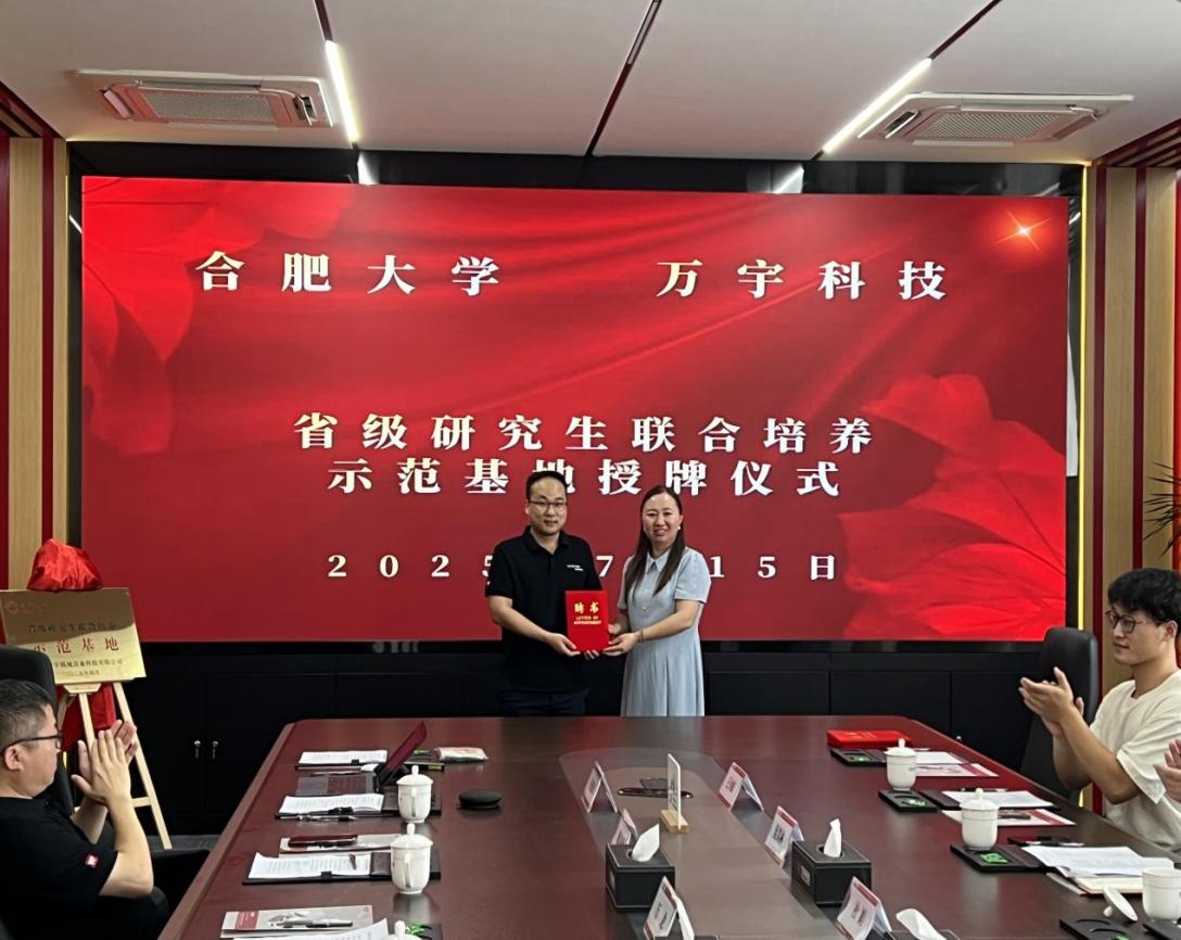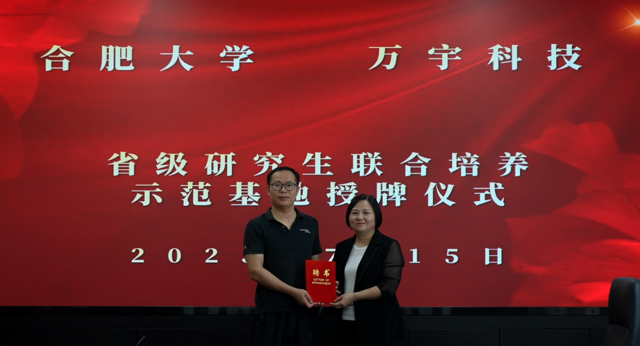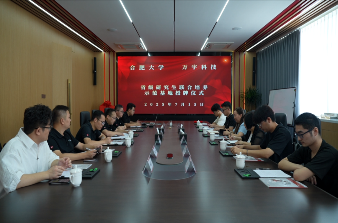 7月15日上午,合肥大学先进制造工程学院与安徽万宇机械设备科技有限公司(以下简称“万宇科技”)省级研究生联合培养示范基地授牌仪式在公司会议室隆重举行。仪式由万宇科技董事长助理杨宏壮主持,万宇科技董事长万龙、总经理童志祥、学院党委书记杜娟、党委委员谷曼、机械系主任吴其林及双方相关企业、师生代表出席了活动。