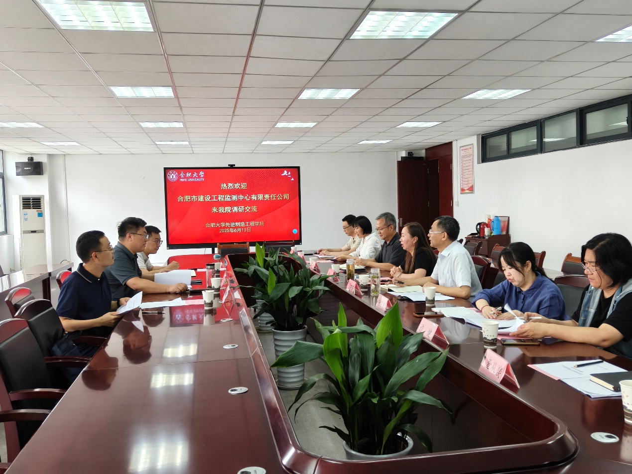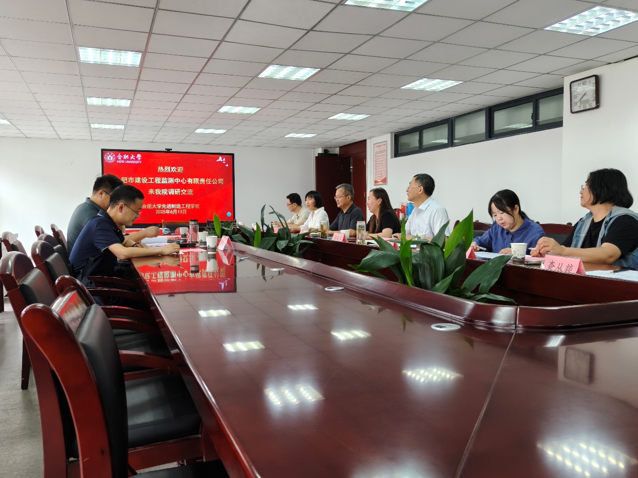 2025年6月13日上午,合肥市建设工程监测中心有限责任公司董事长傅剑、新特所所长王俊以及张恩民一行来我院调研交流,交流座谈会在40栋305会议室召开,先进制造工程学院党委书记杜娟、院长胡学友、副院长秦强及多位教师参加会议。