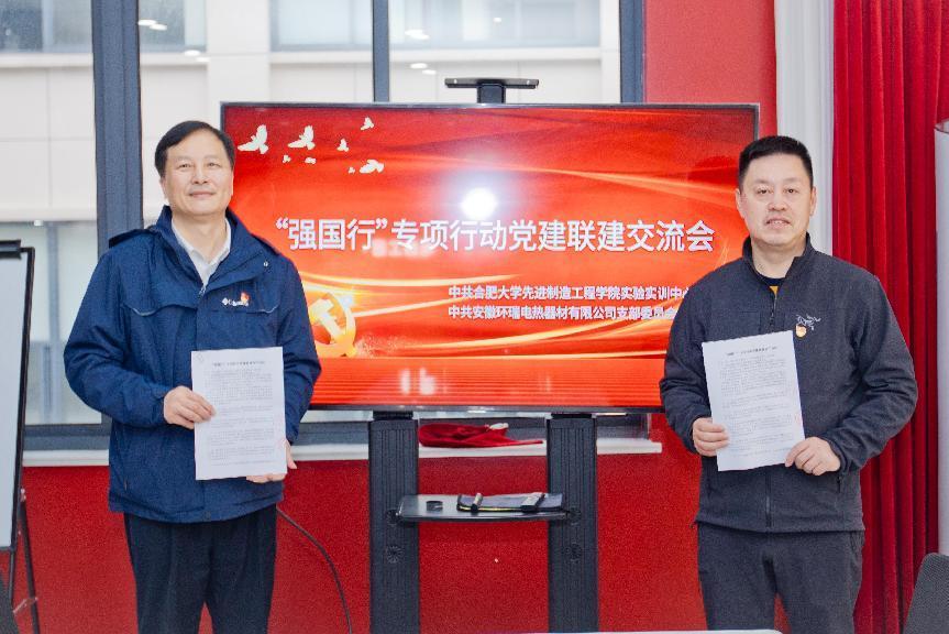 11月25日上午,合肥大学先进制造工程学院实验实训中心党支部赴安徽环瑞电热器材有限公司进行参观交流,双方共同举办了“强国行” 专项行动团队党建联建交流会,深化党建深度合作,通过校企联动、资源整合、优势互补,探索党建工作与企业发展、教育事业协同共进新路径。合肥大学先进制造工程学院党委书记杜娟、学院党委委员、实验实训中心党支部书记高先和及支部委员一起参加共建活动。 双方围绕校企党建联建开展了座谈交流,环瑞公司相关负责人详细介绍了公司的生产运营状况、技术研发成果以及企业文化建设等方面的成效,让大家深入了解了企业发展态势、发展成果。双方重点围绕如何使党建工作与业务融合达到双融双促展开深入探讨。现场,双方党组织签订“强国行” 专项行动党建联建协议。今后将在组织联建、理论联学、活动联办等方面推进合作,共同开展科研项目攻关,加速科技成果转化,提升企业核心竞争力与创新能力。双方党员在党建活动室共同重温入党誓词。 合肥大学先进制造工程学院实验实训中心党支部将立足全国高校”双带头人“教师党支部书记”强国行“专项行动团队建设,充分发挥高校智库资源,带领团队积极投身 “强国行” 专项行动。通过搭建党建联建平台,双方致力于构建联建组织、共抓队伍、共享资源、共谋发展的党建工作新格局,实现党建与业务的双促进、双提升,推动区域经济社会发展。