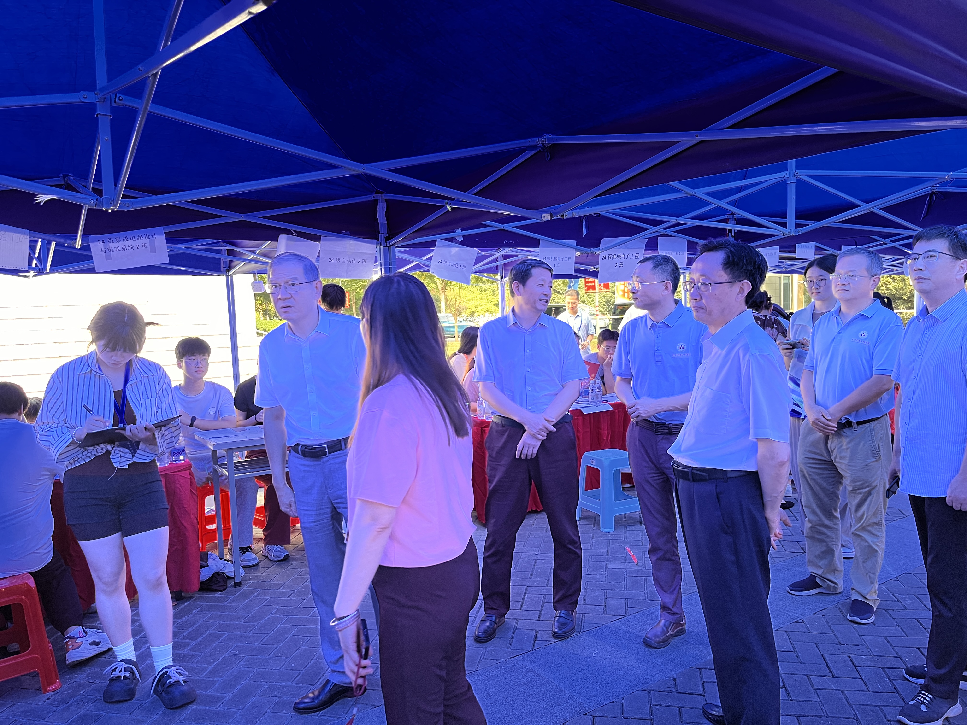 先进制造工程学院党委书记杜娟、院长胡学友、党委副书记蔡灵美、副院长秦强、胡国华等院领导与全体辅导员到现场,与报到新生及家长进行了亲切交流。他们对家长辛苦培育孩子,为学院输送人才表达了感谢,向新生表示了欢迎和祝福,鼓励新生们尽快熟悉校园环境,尽快适应大学节奏,保持积极向上的状态,开启自己精彩的大学生活。学校领导现场视察了解新生报到情况,与学院领导进行交流。