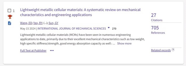 根据科睿唯安(Clarivate Analytics)公布的2024年7月ESI最新数据, 我校先进制造工程学院青年教师王二冬2024年以合肥大学为第一单位在《International Journal of Mechanical Sciences》期刊上发表的长篇综述论文“Lightweight metallic cellular materials: A systematic review on mechanical characteristics and engineering applications”(Volume 270, May 2024)成功遴选为ESI高被引论文。目前,Web of Science数据库显示该文献已经被引用27次。《International Journal of Mechanical Sciences》杂志是机械工程/力学领域国际权威期刊 (中科院一区Top,影响因子:7.1),这是我校机械领域首篇以第一单位入选为ESI全球前1%高被引论文,是我校学科建设取得重要的科学研究成果。 据悉,ESI是基本科学指标数据库(Essential Science Indicators)的简称,由世界著名的学术信息出版机构汤森路透公司(Thomson Reuters)于2001年推出的衡量科学研究绩效、跟踪科学发展趋势的基本分析评价工具。ESI高被引论文(Highly Cited Paper)是指近10年内发表且被引次数排在相应学科领域全球前1%以内的论文。ESI已成当今世界范围内普遍用以衡量高校、学术机构、国家或地区国际学术水平及影响力的重要评价指标工具之一。