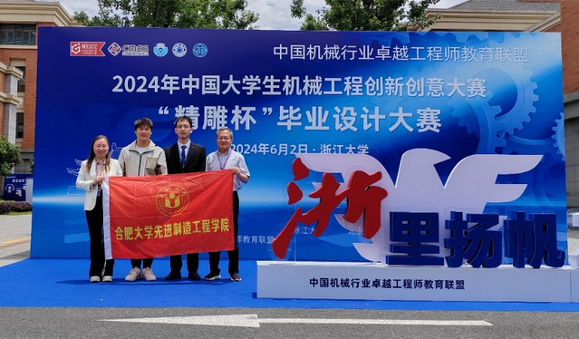 2024年6月2日,由中国机械工程学会和中国机械行业卓越工程师教育联盟共同主办的中国机械行业卓越工程师教育联盟“精雕杯”毕业设计大赛决赛在浙江大学举行。先进制造工程学院党委书记杜娟、副院长秦强带队,2020级机制专业王森同学携其毕业设计作品参赛,获比赛佳作奖。 中国机械行业卓越工程师教育联盟“精雕杯”毕业设计大赛所有参赛题目均须源于企业,旨在培养学生解决实际工程问题的能力,提高学生的创新意识。本次大赛共征集到来自清华大学、上海交通大学、浙江大学等119所高校提交的1139项作品,经过形式审查,共有1105项作品进入区域赛评审。经区域赛评审,最终228个项目入围决赛的资格。