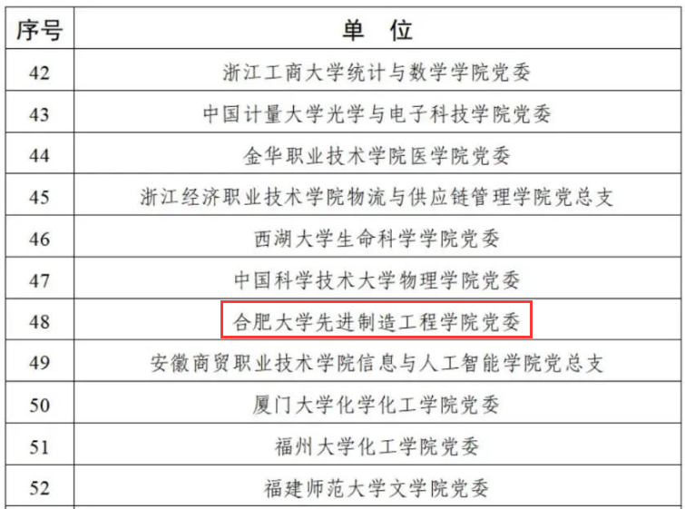 2024年3月18日,教育部思想政治工作司对第四批新时代高校党建示范创建和质量创优工作遴选结果进行公示,合肥大学先进制造工程学院党委成功入选第四批“全国党建工作标杆院系”培育创建单位,实验实训中心党支部入选第四批“全国党建工作样板支部”培育创建单位。