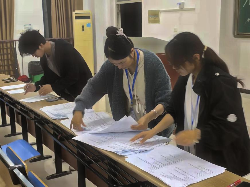 会前,相关工作人员集合,在接受赛前培训、明确工作分配之后分别前往指定地点布置考场,等待参赛选手进入考场。随后,参赛选手在工作人员的引导下依次入座,讲解考场规则,分发试卷。工作人员各司其职,认真巡视考场,解决突发问题,维护考场秩序,确保比赛公平公正。