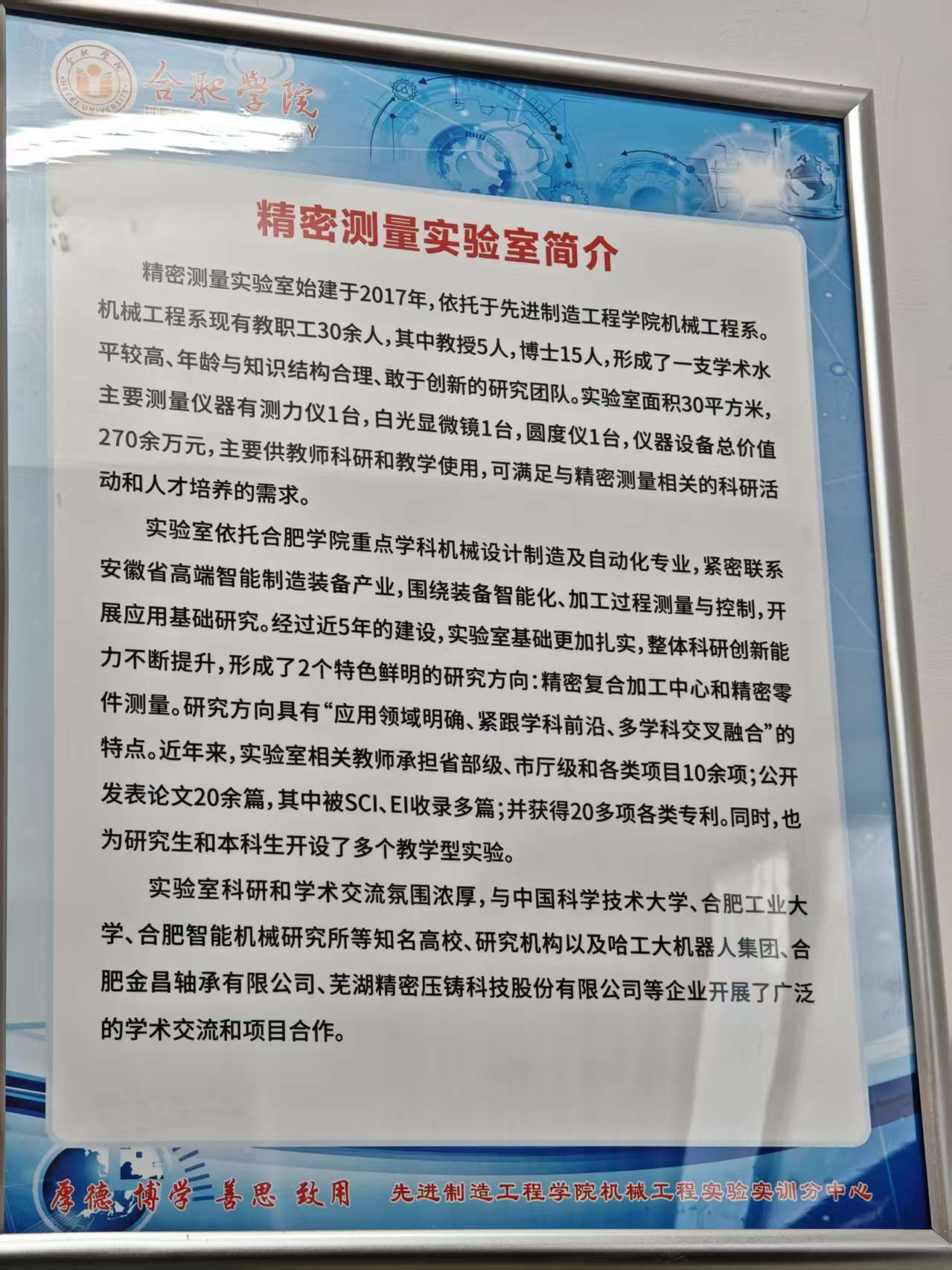 精密测量实验室始建于2017年,依托于先进制造工程学院机械工程系。机械工程系现有教职工30余人,其中教授5人,博士15人,形成了一支学术水平较高、年龄与知识结构合理、敢于创新的研究团队。实验室面积30平方米,主要测量仪器有测力仪1台,白光显微镜1台,圆度仪1台,仪器设备总价值270余万元,主要供教师科研和教学使用,可满足与精密测量相关的科研活动和人才培养的需求。 实验室依托合肥学院重点学科机械设计制造及自动化专业,紧密联系安徽省高端智能制造装备产业,围绕装备智能化、加工过程测量与控制,开展应用基础研究。经过近5年的建设,实验室基础更加扎实,整体科研创新能力不断提升,形成了2个特色鲜明的研究方向:精密复合加工中心和精密零件测量。研究方向具有“应用领域明确、紧跟学科前沿、多学科交叉融合”的特点。近年来,实验室相关教师承担省部级、市厅级和各类项目10余项;公开发表论文20余篇,其中被SCI、EI收录多篇;并获得20多项各类专利。同时,也为研究生和本科生开设了多个教学型实验。 实验室科研和学术交流氛围浓厚,与中国科学技术大学、合肥工业大学、合肥智能机械研究所等知名高校、研究机构以及哈工大机器人集团、合肥金昌轴承有限公司、芜湖精密压铸科技股份有限公司等企业开展了广泛的学术交流和项目合作。