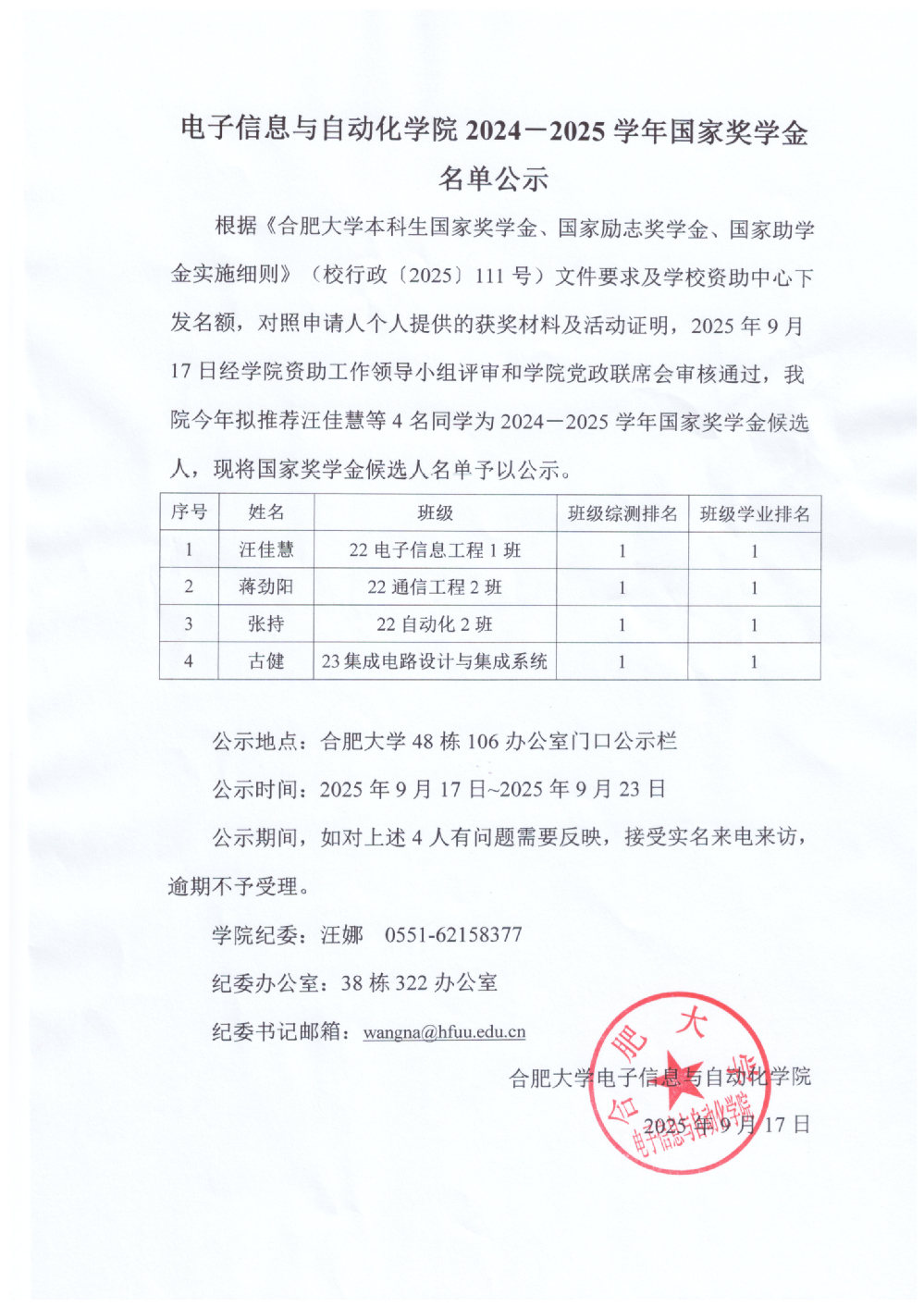 电子信息与自动化学院2024-2025学年国家奖学金名单公示
