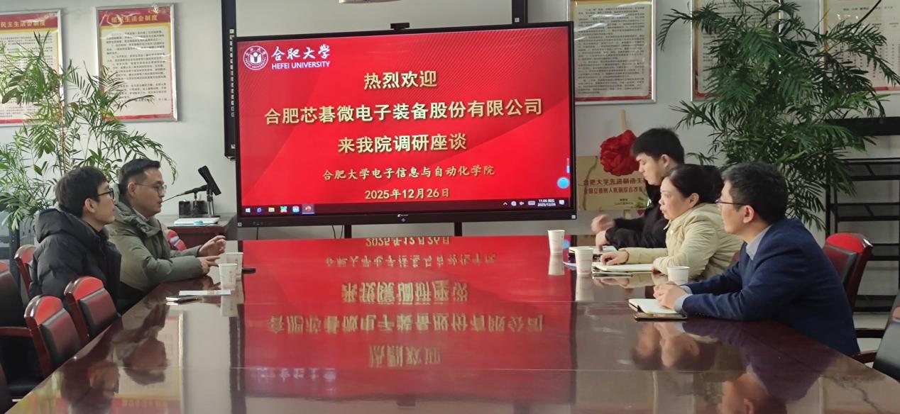 2025年12月26日,合肥芯碁微电子装备股份有限公司一行到访合肥大学电子信息与自动化学院,双方举行校企合作座谈交流会。学院党委副书记汪娜,副院长石朝毅、年福东出席会议,芯碁微装人力资源部经理韩超凡率队参会。座谈会上,校企双方聚焦毕业生就业招聘、实习实践基地建设、产学研协同融合等方面内容,进行了深入沟通与交流探讨。