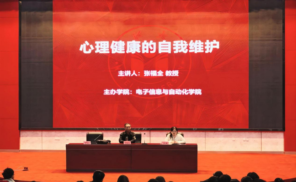 为进一步加强大学生心理健康教育,引导学生树立科学理性的心理健康观念,营造积极向上、健康和谐的校园心理氛围,2026年3月9日下午,电子信息与自动化学院在图书馆报告厅A厅顺利举办“心理健康的自我维护”专题讲座。本次讲座特邀张福全教授主讲,学院党委副书记汪娜、辅导员刘明娟出席,各班班干、寝室长(心理联络员)及心理学爱好者到场学习。