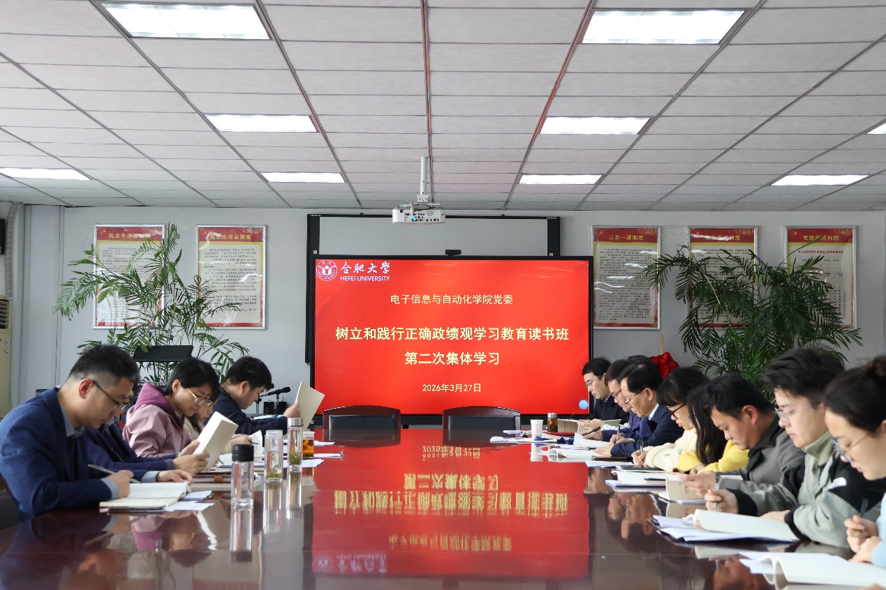 3月27日上午,电子信息与自动化学院党委举行树立和践行正确政绩观学习教育读书班第二次集体学习暨院党委理论学习中心组(扩大)学习。院党委书记毛小芳主持。学院处级党员领导干部、组织员、各党支部书记、教师党员代表和学生党员代表参加学习。 毛小芳领学了《习近平关于树立和践行正确政绩观论述摘编》第四章“坚持高质量发展要成为领导干部政绩观的重要内容”(节选),强调坚持创新发展、协调发展、绿色发展、开发发展、共享发展;院党委副书记、院长胡学友领学《习近平关于树立和践行正确政绩观论述摘编》第五章“坚持功成不必在我、功成必定有我,以实干出政绩”(节选),牢记“实干兴邦,空谈误国”,要真正做到一张蓝图干到底,切实干出成效来;院党委副书记、纪委书记汪娜领学《生动实践》福建篇,体会习近平总书记在附件17年来严谨务实的作风和心系人民的情怀;副院长石朝毅领学《论教育》中“扎实推动教育强国建设”,再次深刻理解“教育、科技、人才”的基础性、战略性支撑地位;副院长年福东领学《习近平在参加江苏代表团审议时强调:经济大省要在研究新情况解决新问题上下功夫出经验》,对在新情况、新问题下经济大省的带头作用有了新的认识。