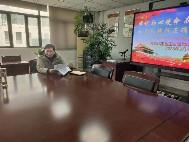2026年3月24日在38栋305会议室,自动化系教工党支部书记孙强以《牢记初心使命 在教育教学中树立和践行正确政绩观》为主题,为全体与会党员进行树立和践行正确政绩观专题党课讲授,支部13名在职教师党员全员参加了学习。