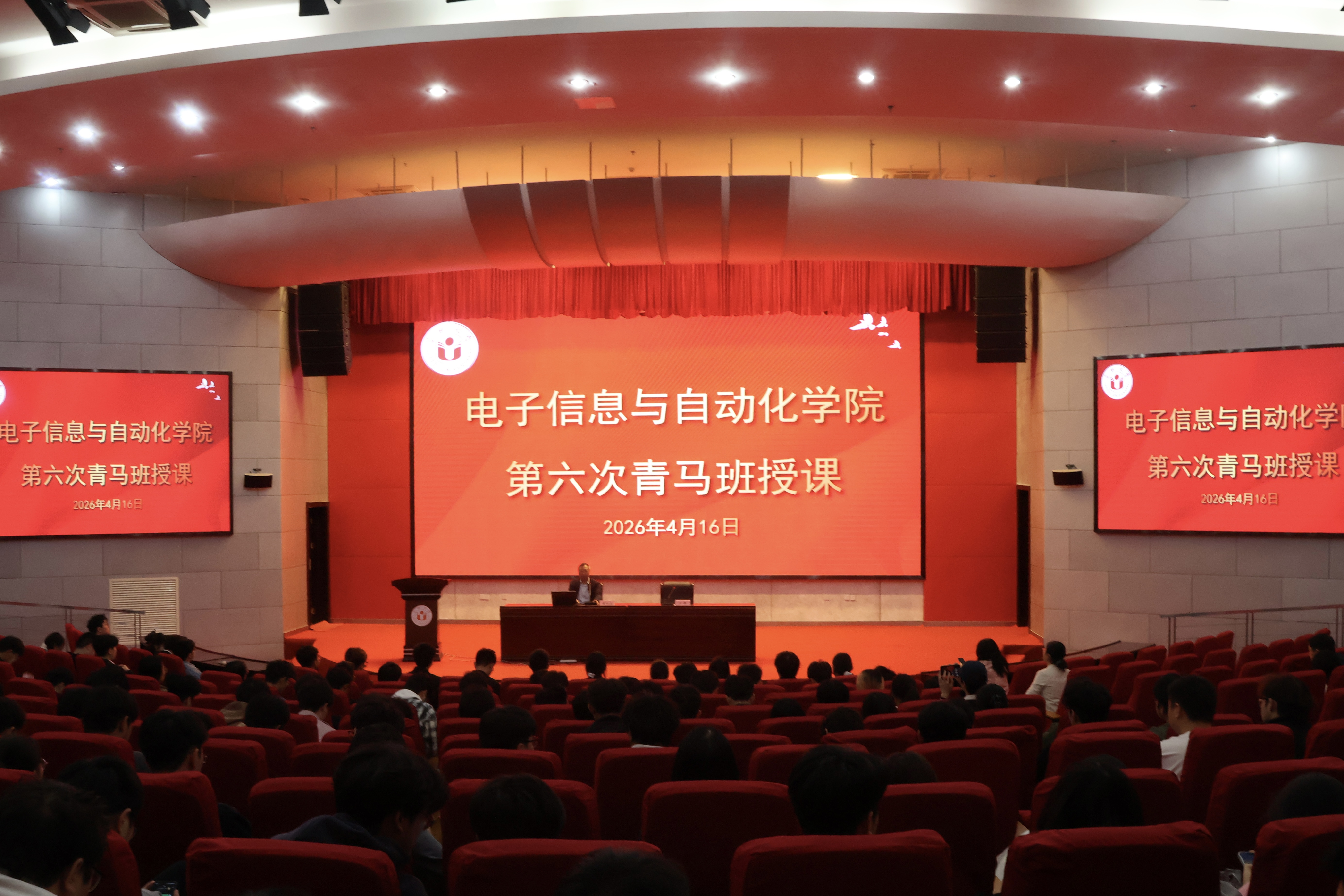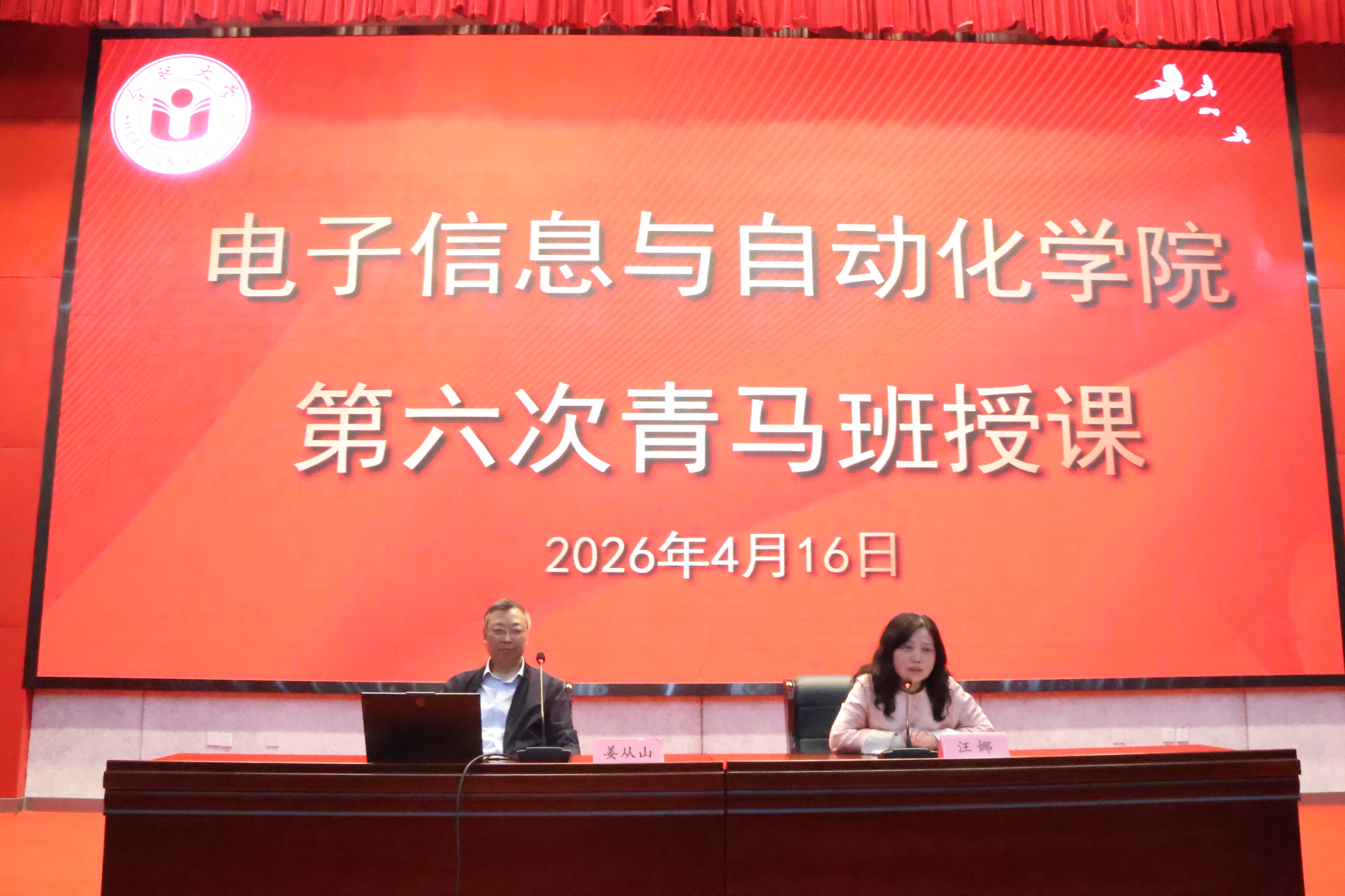 为引导青年学生深入学习党的百年光辉历程,传承红色基因,坚定理想信念,2026年4月16日中午,电子信息与自动化学院在图书馆A厅举办“中国共产党百年辉煌”专题思政讲座暨第六次青马班授课。本次讲座特邀合肥大学马克思主义学院退休副教授姜从山主讲,学院党委副书记、纪委书记汪娜主持,200余名师生现场聆听。