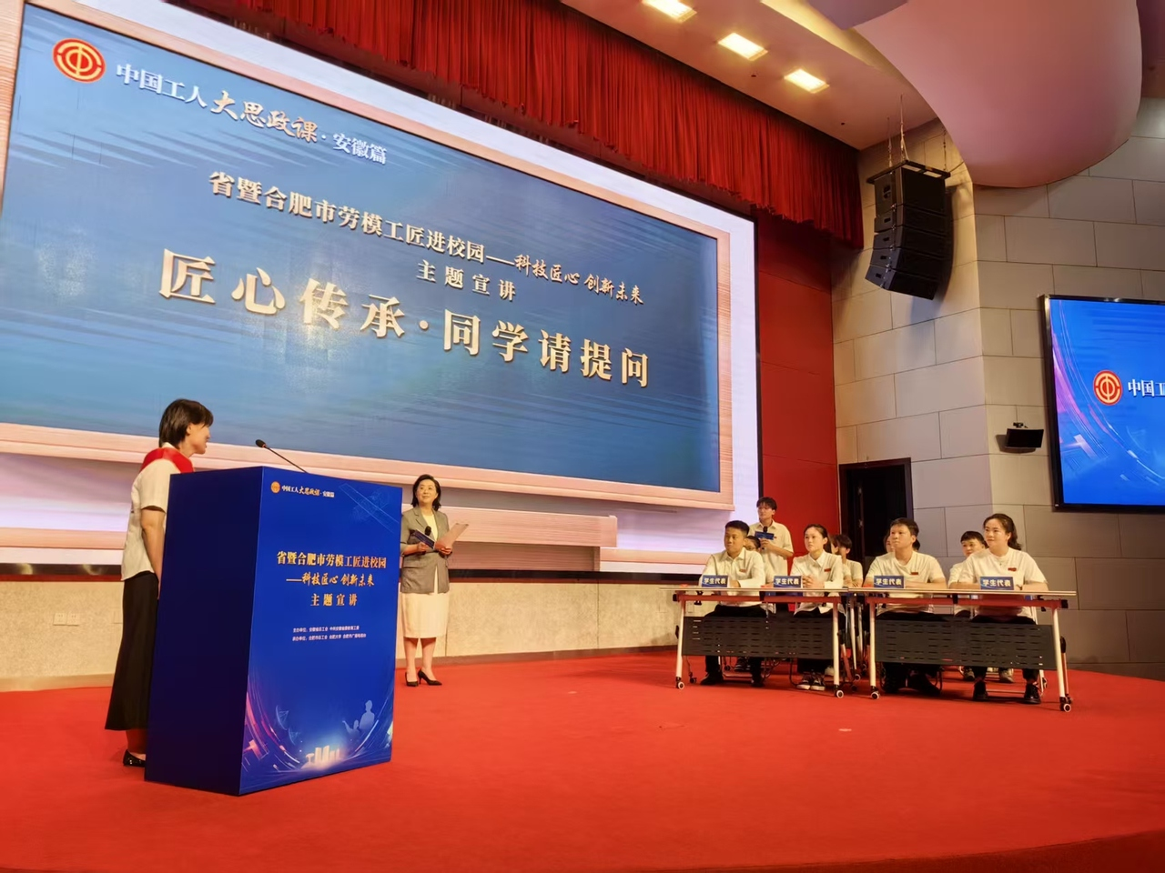 9月17日下午,合肥大学图书馆报告厅A厅内掌声阵阵、气氛热烈,由安徽省总工会主办,合肥市总工会、合肥大学、合肥市广播电视台承办的中国工人大思政课·安徽篇省暨合肥市“劳模工匠进校园——科技匠心 创新未来”主题宣讲活动在此举行。