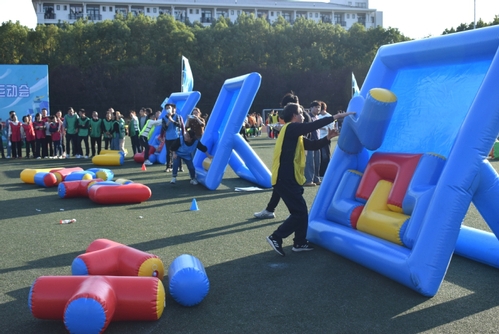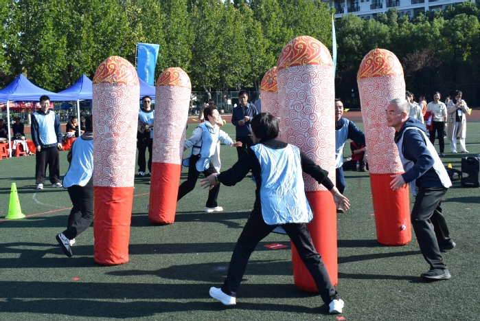 本次趣味运动会项目丰富多彩,在“运动火炬”项目中,参赛教师配合默契,动作流畅,展现出高度的团队协作精神;“步步高升”比赛中,大家紧握绳索,高效堆叠充气方块,每一次“升高”都凝结着集体的智慧与力量;“俄罗斯方块”环节,教师们迅速判断、精准拼合,思维的活力在运动中迸发;“同心协力”项目中,各队步伐一致、携手前行,用整齐的动作诠释了团结的内涵。